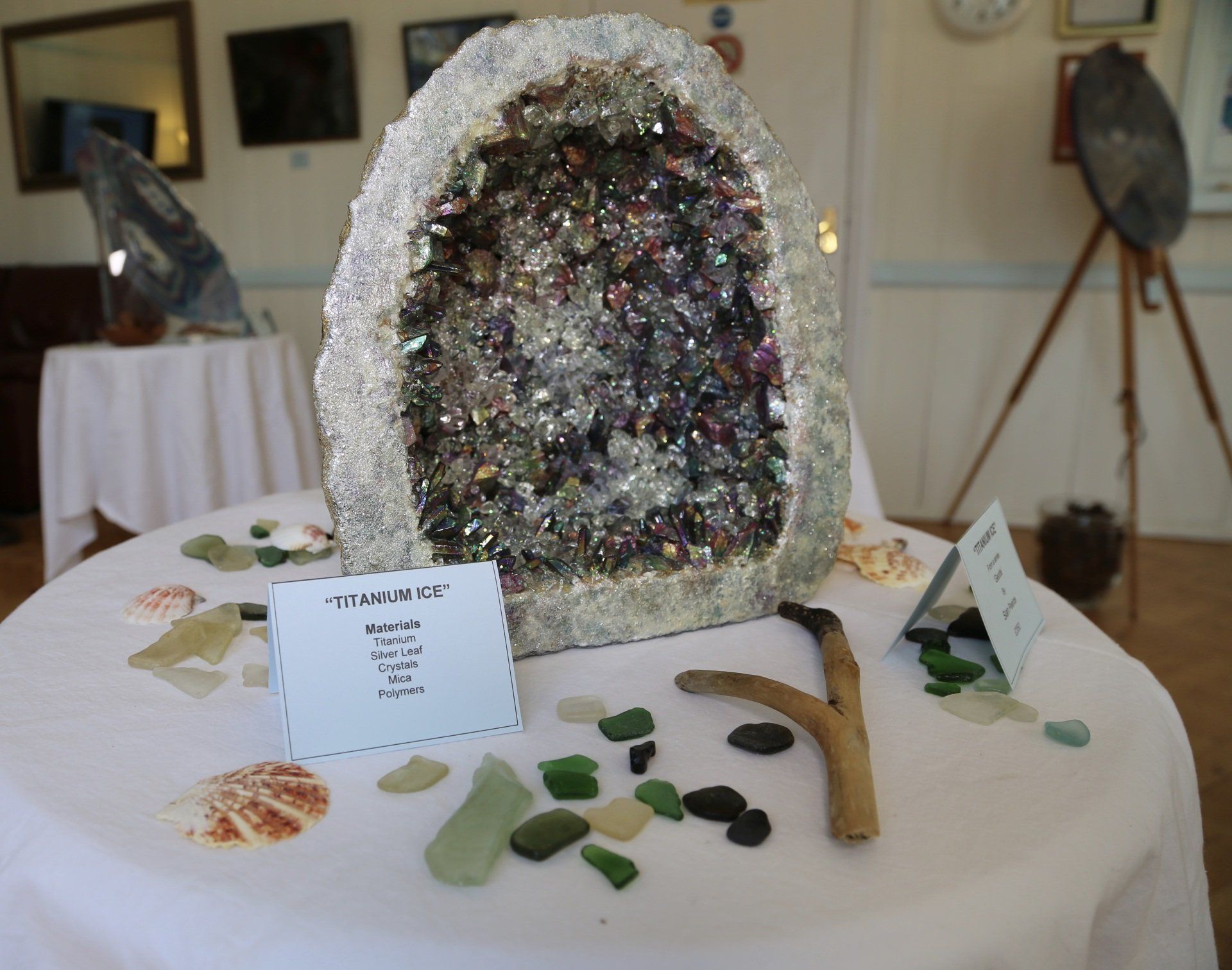 Titanium Ice is Fashioned from mineral composites, natural and hand formed crystals, acrylics, titanium and silver leaf