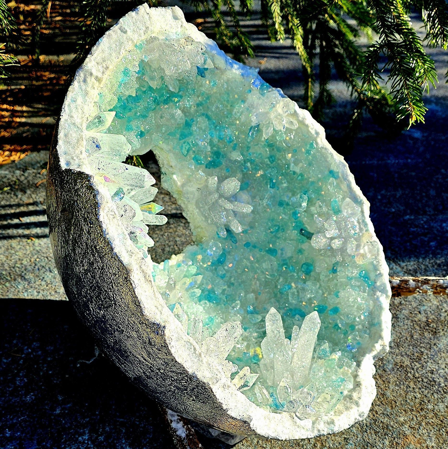 Frozen in Time comprises hand crafted crystals, quartz crystals, faceted aquamarine gemstones, moissanite diamonds, mica and glass. The foundation is synthetic polymer with pure silver leaf overlay.