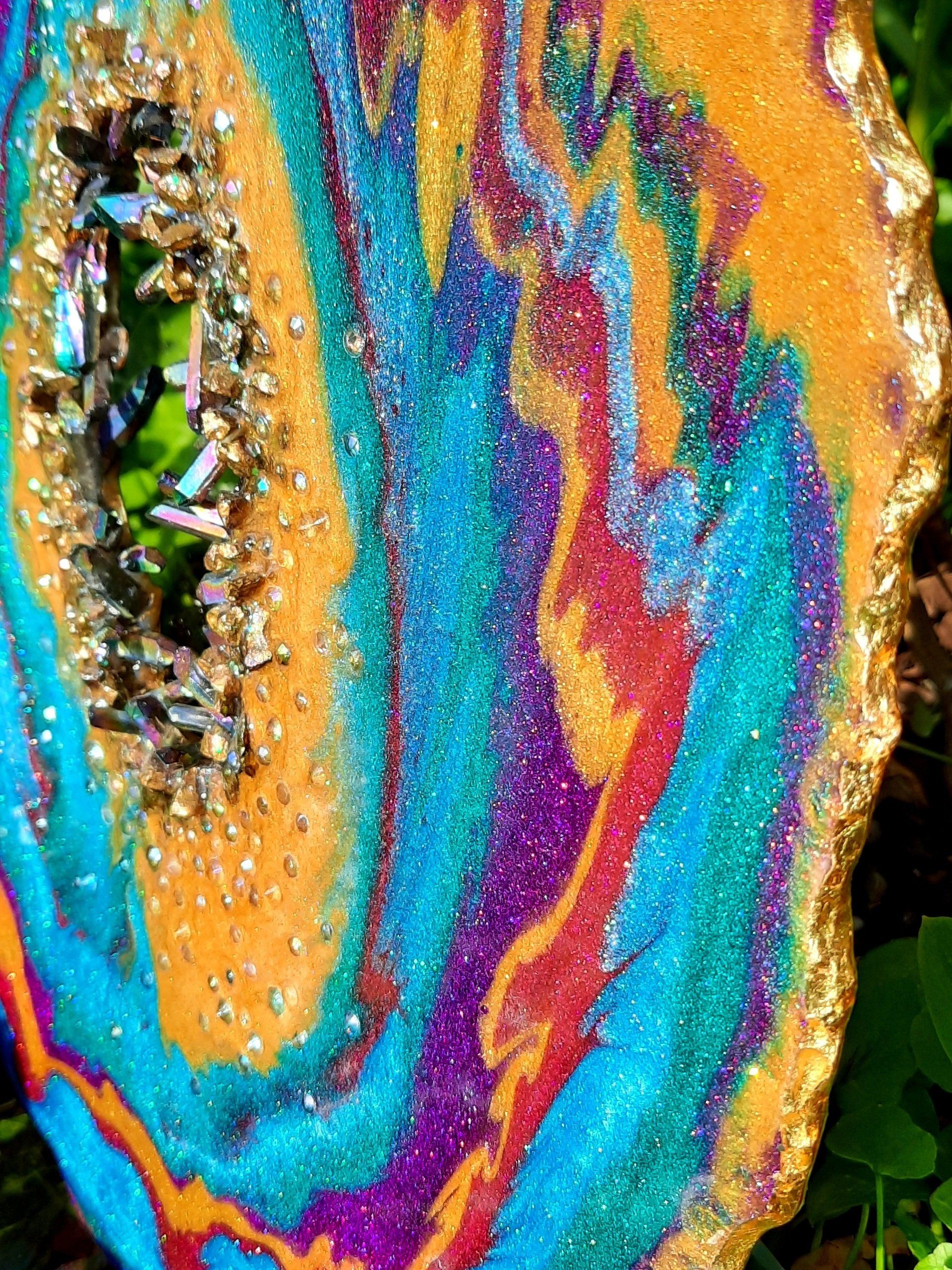 Fashioned from acrylics, mica, natural and hand formed crystals, gold edged.